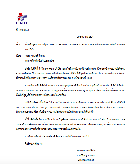 ไอทีซิตี้ ชี้แจง พนักงานทุจริตสูญ 90 ล้าน ไม่กระทบสภาพคล่อง